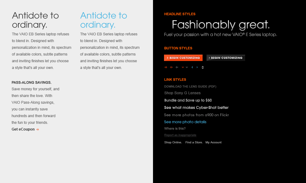 Led the design and user experience initiatives for store.sony.com (Sony Style), Sony Electronics’ e-commerce platform. Actively working on improving online product catalogs and brand experiences – driving online sales and brand engagement.